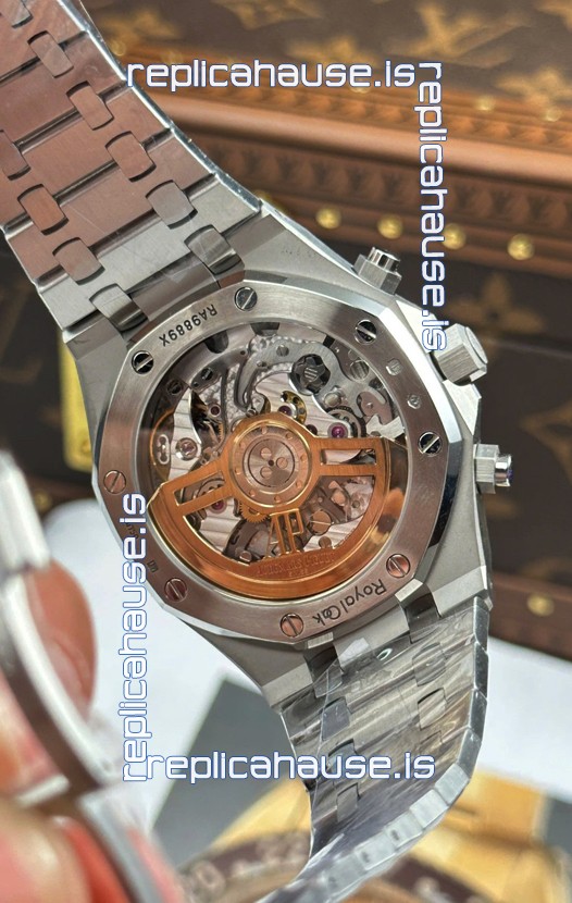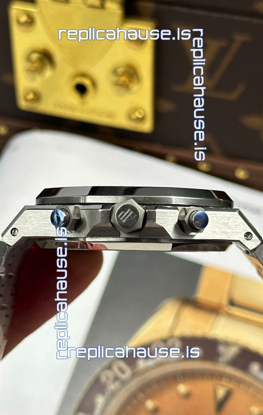 Machinery Layout exactly like Audemars Piguet 4401 Calibre Movement used in Authentic Audemars Piguet Offshore Watches. Built on Genuine Swiss 7753 Movement architecture with Functional stopwatch feature like the authentic with Seconds hand running at the 12 o clock Sub Dial