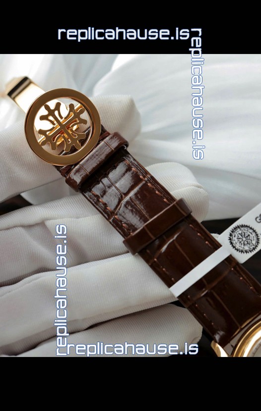 Genuine Swiss 9015 Movement assembled to Resemble the Authentic Patek Philippe PP 324 Calibre Style Movement. Updated Rotor, Bridged and Engravings on Movement with Rose Gold Plated Patek Philippe Stamped Rotor