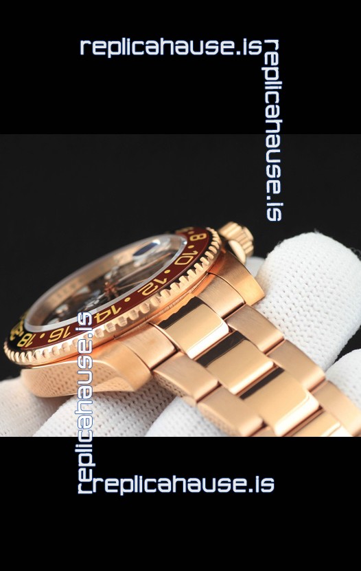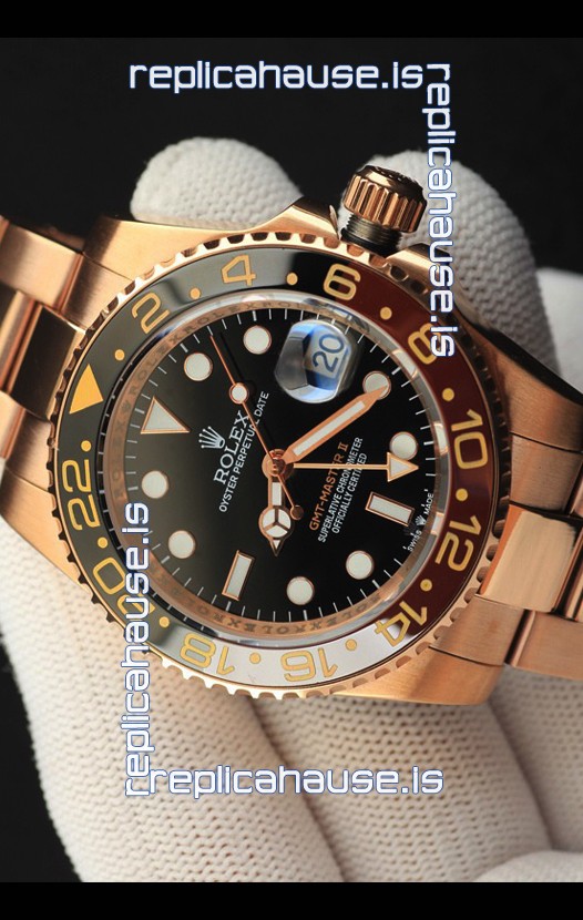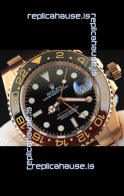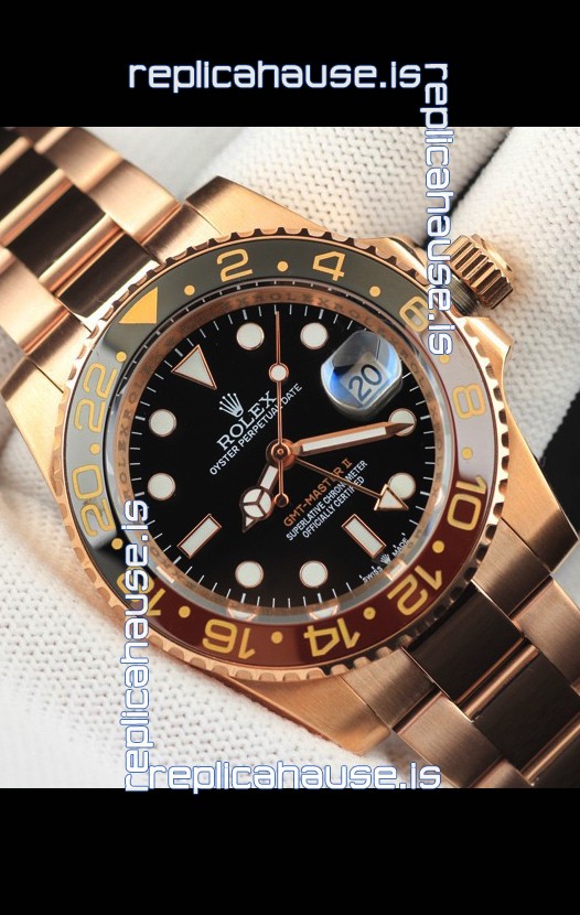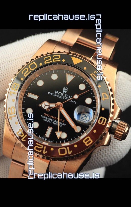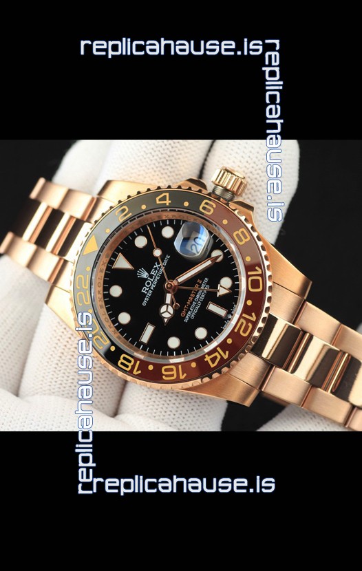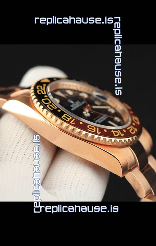 You're reviewing: Rolex GMT Masters II Rose Gold Plating Japanese Replica Watch Black Dial