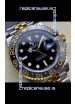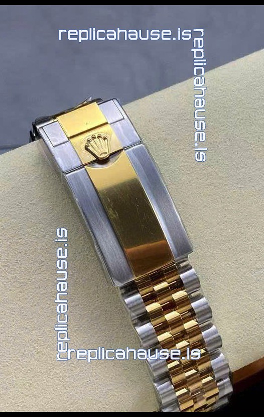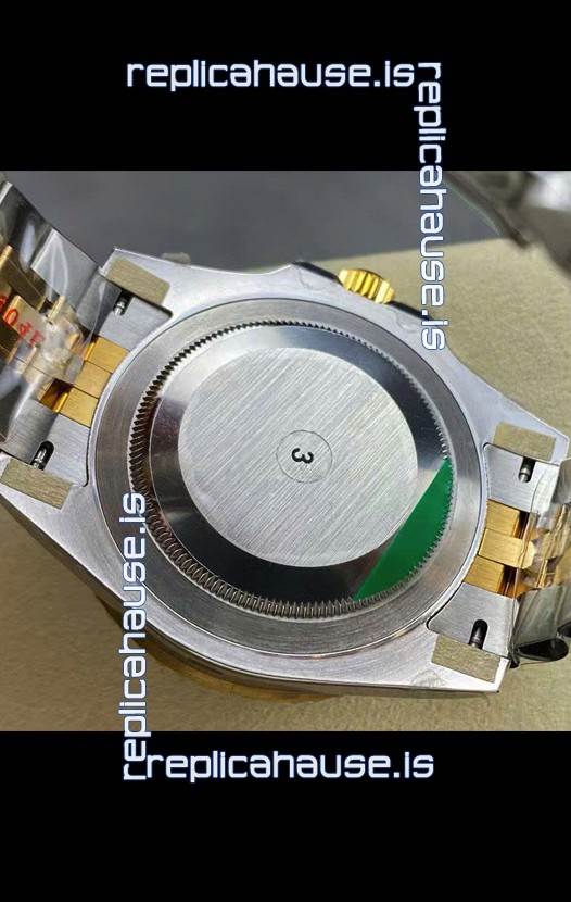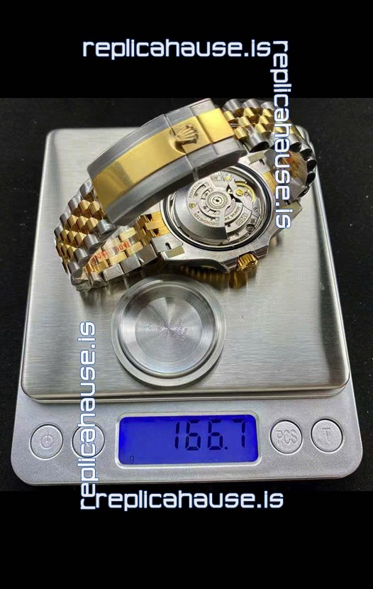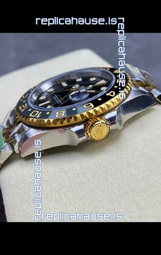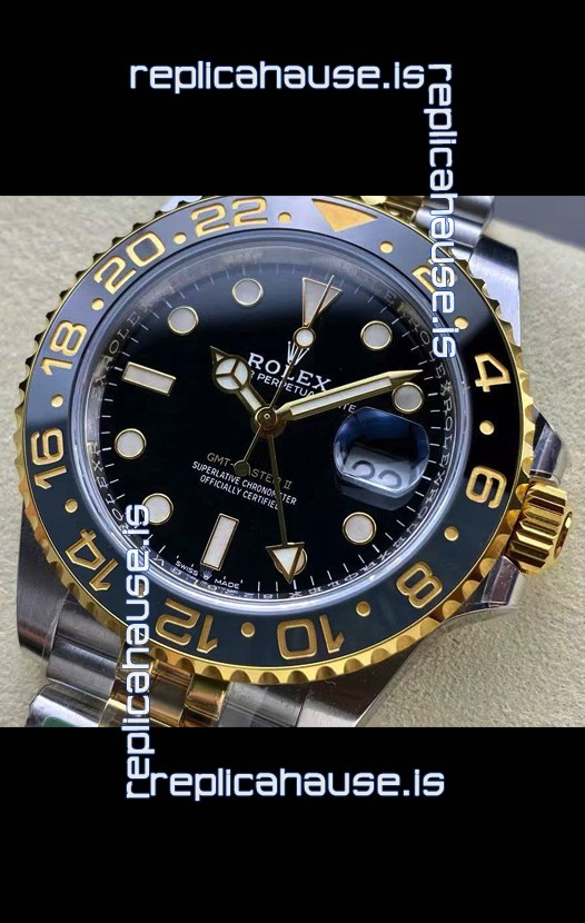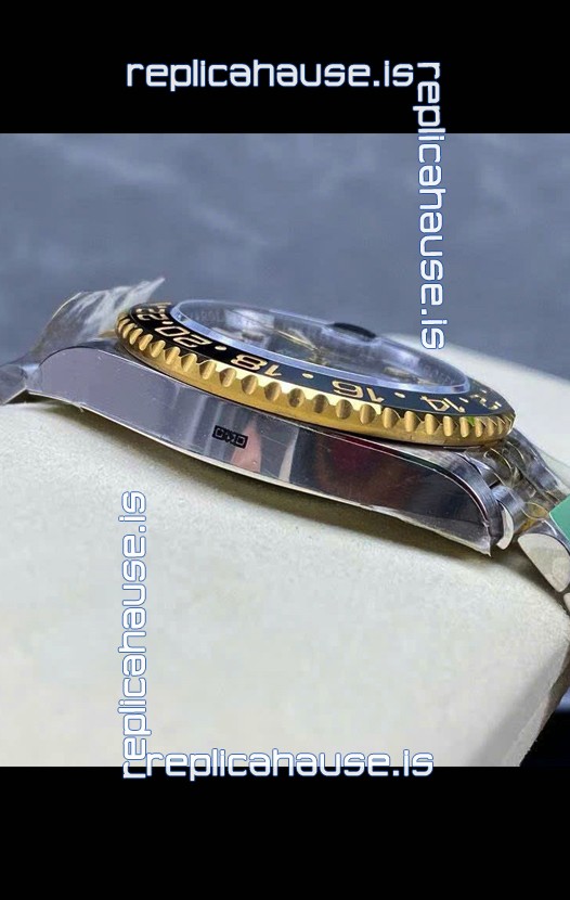 Two Tone Yellow Gold Plating 904L Stainless Steel Case as per the Orginal with Metallic Black/Blue Ceramic Inserts.